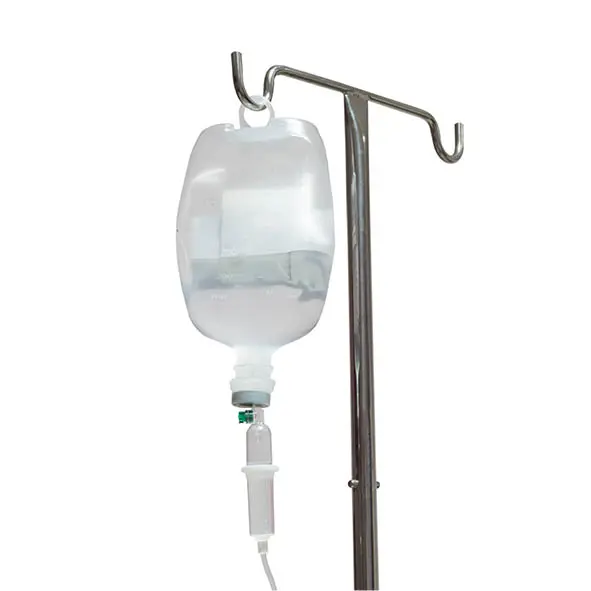IV pole on wheels, height-adjustable, for hanging infusion bags or connecting feeding devices.